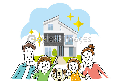 不動産イラスト 住宅展示場で憧れの住まいを思い描く幸せ家族イラスト